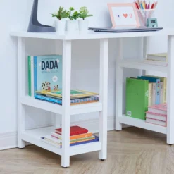 AMPLIO ALMACENAMIENTO: ¡2 estantes a cada lado debajo de la mesa son perfectos para usar como estanterías, almacenamiento para blocs de notas, manualidades o útiles escolares y más!