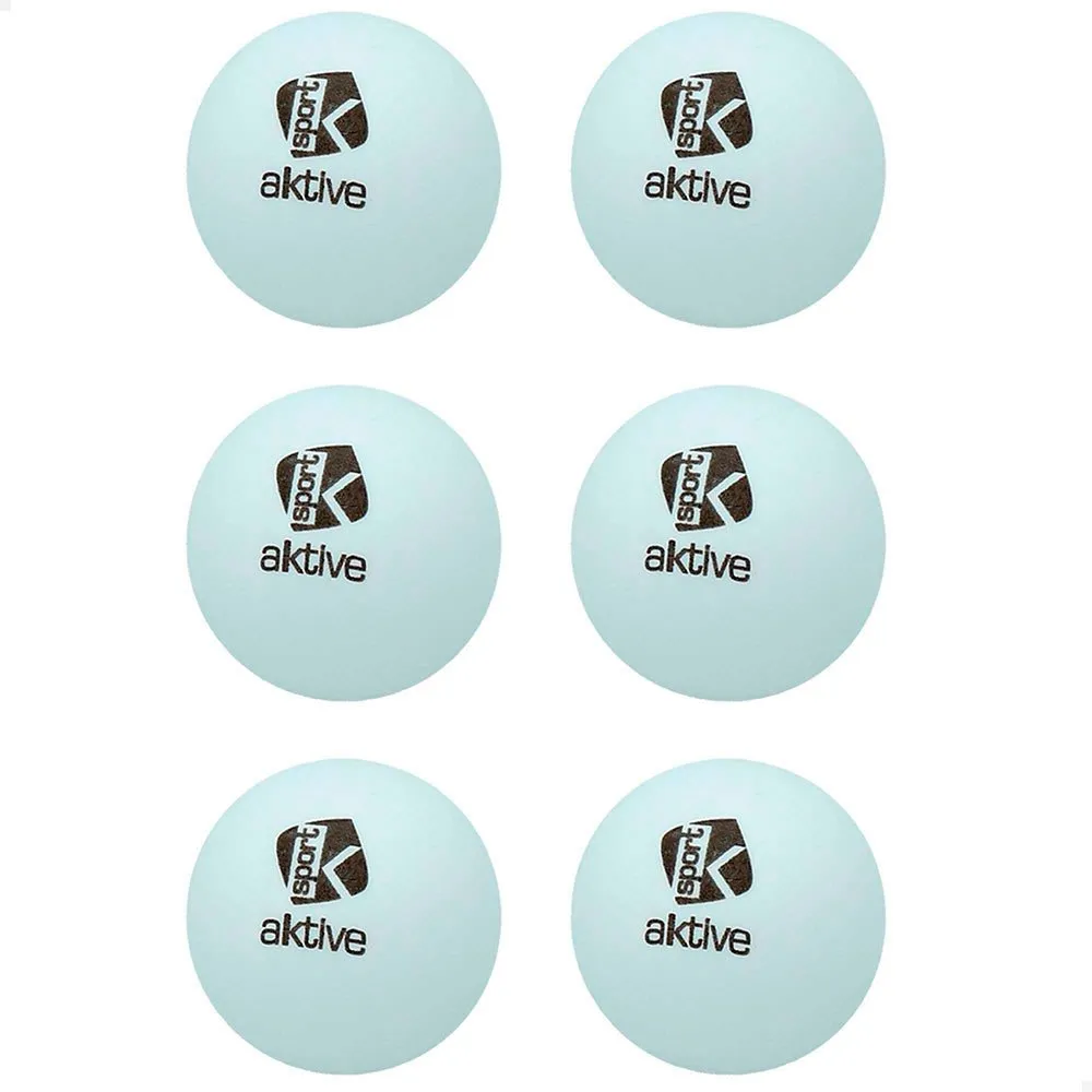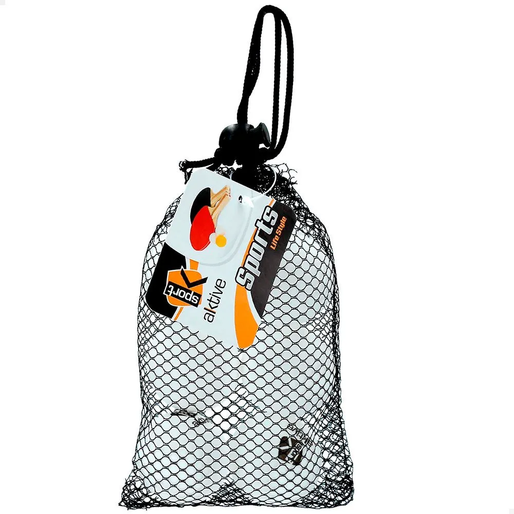 Bolsa de red con cierre de cordón que contiene 6 pelotas de ping-pong en color blanco.